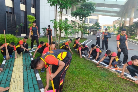 Para personel Polri dikerahkan untuk membersihkan halaman, saluran drainase, serta area perkantoran Mapolda Kalsel yang berlokasi di Jalan Dharma Praja Timur, Kelurahan Cempaka, Banjarbaru.